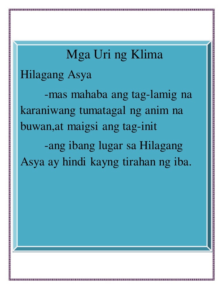 Basahin at unawain mo itong mabuti at batay sa mga datos at paglalarawan dito ay bumuo ka ng paghihinuha kung paanong ang klima ay nakaimpluwensya sa pamumuhay ng mga asyano. Narito ang isang talahanayan na nagpapakita ng ibat-ibang uri ng klima sa mga rehiyon ng Asya. HILAGANG ASYA Sentral Kontinental.