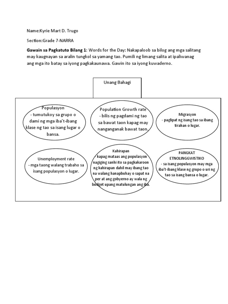 Pumili ng limang salita at ipaliwanag ang mga ito batay sa iyong pagkakaunawa. Paggamit ng mga salitang nasa wikang Filipino sa pagbibigay ng mga halimbawa. Nakapaloob sa bilog ang mga salitang may kaugnayan sa aralin tungkol sa yamang tao.