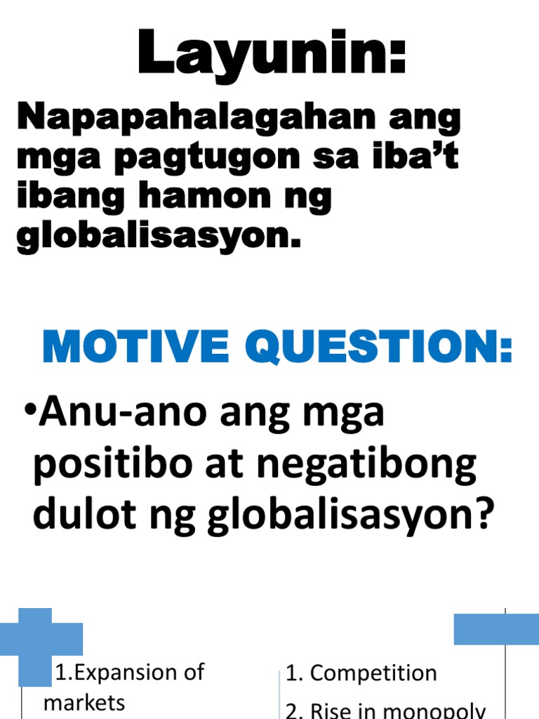 Negatibong Epekto ng MNC at TNC. Maihayag ang saloobin tungkol sa positibo at negatibong epekto ng globalisasyon at ang Ikalawang bahagi ay ang maihayag ang saloobin sa epekto ng globalisasyon sa mga isyu sa paggawa at migrasyon. Dahil sa globalisasyon nabuwag ang mga hadlang sa kalakalan nagsama-sama ang pangunahing mga stock market sa daigdig at naging mas mura at madali ang paglalakbay.